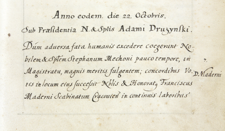 Z urzędowego spisu rajców obejmującego lata 1363–1802 fragment strony 25 z wpisem o wyborze do rady miejskiej na miejsce po zmarłym Stefanie Mechonim (nr 551) Jana Franciszka Maderniego (nr 552), czego dokonano za kadencji burmistrzowskiej Adama Drużyńskiego w 1682 roku – oraz powiększenie zapisu imienia i funkcji burmistrza (Archiwum Państwowe w Krakowie, sygn. rkps 1477, s. 25)