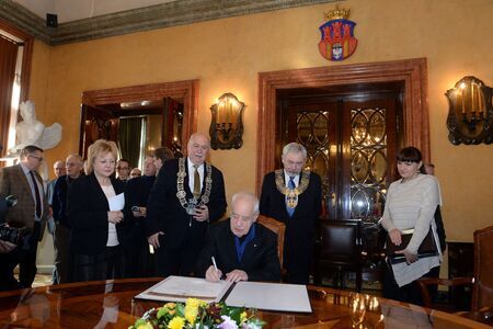 Z uroczystego wręczenia dyplomu honorowego obywatelstwa 29 października 2014 r. w Pałacu Wielopolskich. Adam Macedoński w Sali Obrad RMK oraz własnoręczny podpis uhonorowanego.