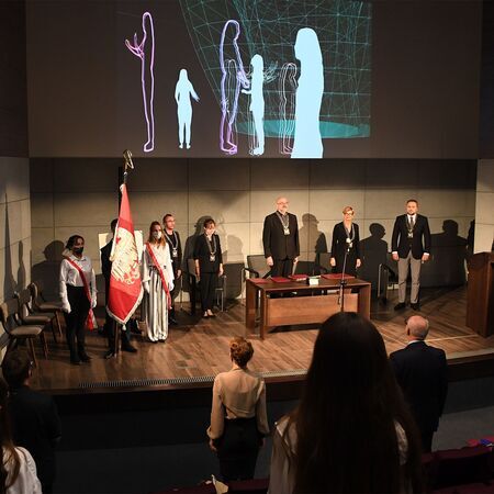 Z uroczystego wręczenia medalu z dyplomem w ramach inauguracji roku akademickiego 5 października 2020 r. w auli Akademii przy pl. Jana Matejki w Krakowie. Otwarcie uroczystości oraz logo laureatki.