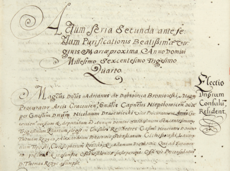 Z księgi radzieckiej Kazimierza obejmującej lata 1634–1637: wpis dokumentujący wybór rady urzędującej na rok 1634, z Aleksandrem Zaborskim zwanym Pokorowiczem w składzie – oraz zbliżenie zapisu imienia (Archiwum Narodowe w Krakowie, sygn. K 39, s. 51)
