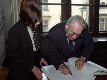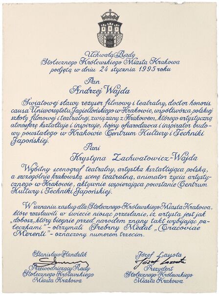 Z uroczystości wręczenia medalu i dyplomu 26 kwietnia 1995 r. w Pałacu Wielopolskich. Andrzej Wajda i Krystyna Zachwatowicz-Wajda prezentują medal.