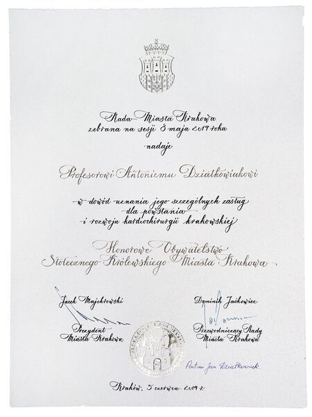 …w dowód uznania Jego szczególnych zasług dla powstania i rozwoju kardiochirurgii krakowskiej… (z uchwały Rady Miasta Krakowa nr XV/272/19) |