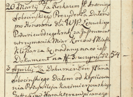 Z akt rachunkowych Kleparza obejmujących rozliczenia lonerskie z lat 1775–1784: wpisy z 1776 roku dokumentujące wydatki poczynione na polecenie Antoniego Sobocińskiego, wówczas burmistrza kleparskiego, przeznaczone na zapłatę za legalizację miary korców miasta Kleparza i za skopiowanie z grodzkich ksiąg oblatowanego tam Przywileju Kazimierzowskiego Gottzkim Karakterem pisanego – oraz zbliżenie zapisu imienia i funkcji (Archiwum Narodowe w Krakowie, sygn. KL 127, s. 15)