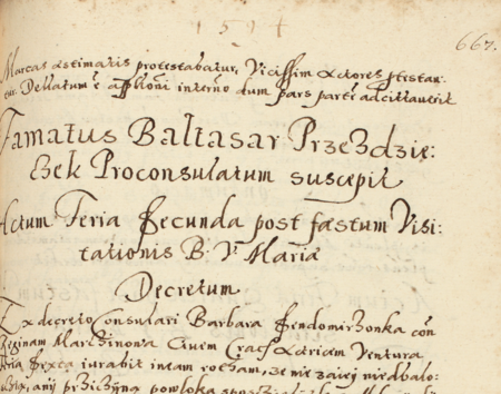 Z księgi radzieckiej Kleparza obejmującej lata 1590–1595: wpis z 1594 roku otwierający sprawy załatwiane podczas kadencji burmistrzowskiej rajcy Baltazara Przezdzieczka – oraz zbliżenie zapisu imienia (Archiwum Narodowe w Krakowie, sygn. KL 30, s. 667)