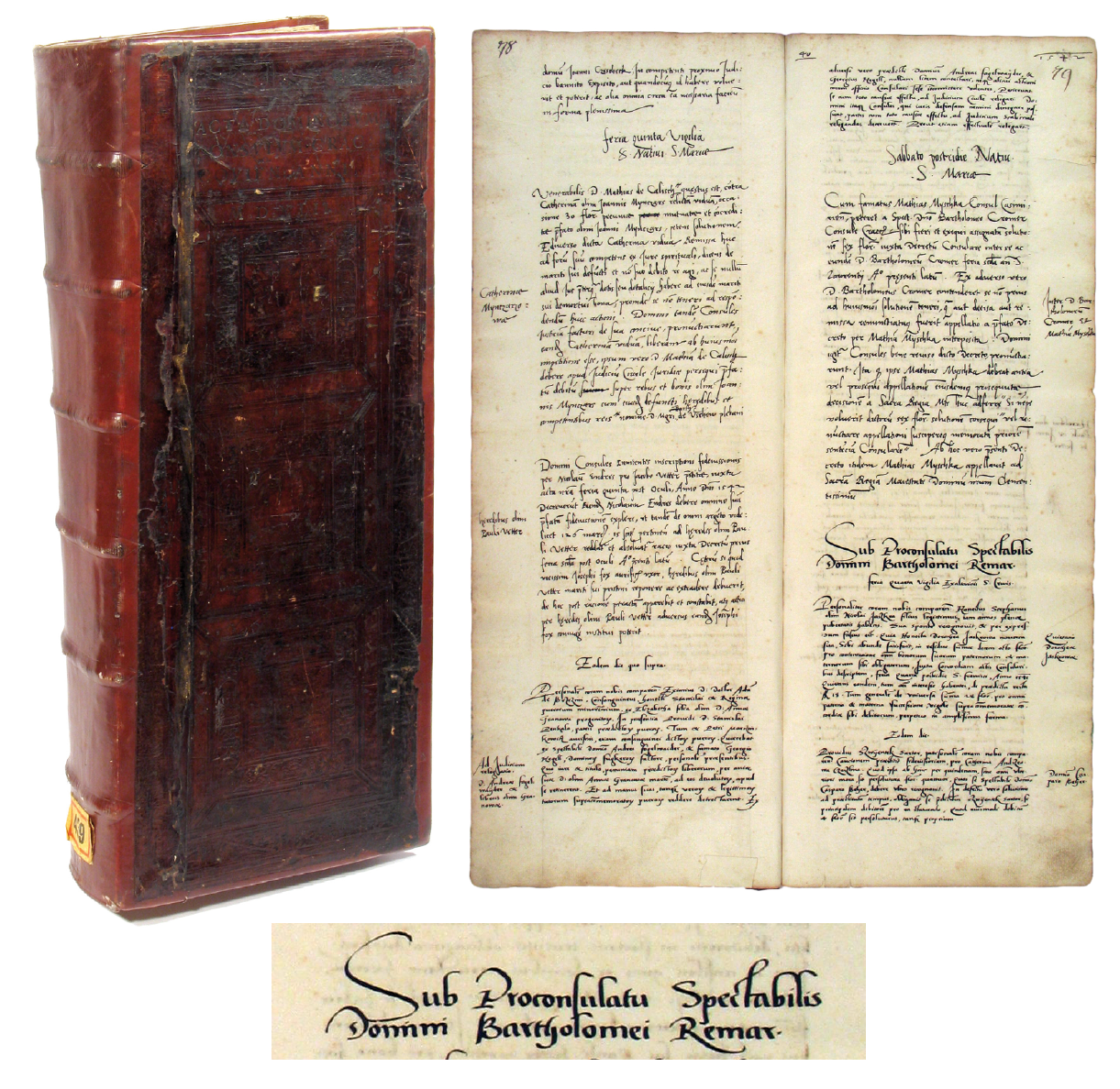 Z księgi radzieckiej obejmującej lata 1542–1545 przód okładziny i strony 78–79 z nagłówkiem otwierającym wpisy spraw dziejących się za urzędowania burmistrza Bartłomieja Remera w drugim półroczu 1542 roku – oraz powiększenie zapisu imienia i funkcji burmistrza (Archiwum Państwowe w Krakowie, sygn. rkps 439, s. 78–79)