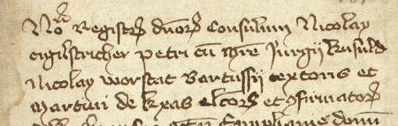 Z księgi radzieckiej Kazimierza obejmującej lata 1387–1390: fragment wpisu dokumentującego wybór rajców na rok 1390, z Bartłomiejem sukiennikiem w składzie – oraz zbliżenie zapisu imienia (Archiwum Narodowe w Krakowie, sygn. K 3, s. 181)