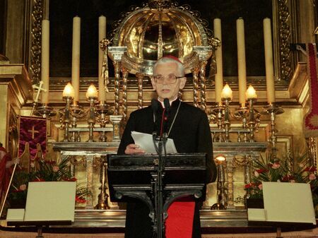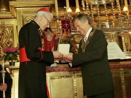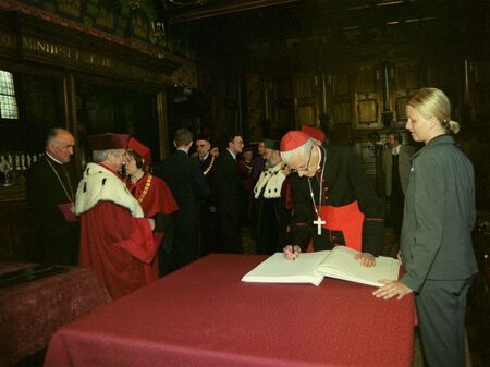 Z uroczystości wręczenia medalu z dyplomem 12 maja 2000 r. w katedrze na Wawelu. Wystąpienie abp. metropolity krakowskiego kard. Franciszka Macharskiego oraz herb biskupstwa krakowskiego.