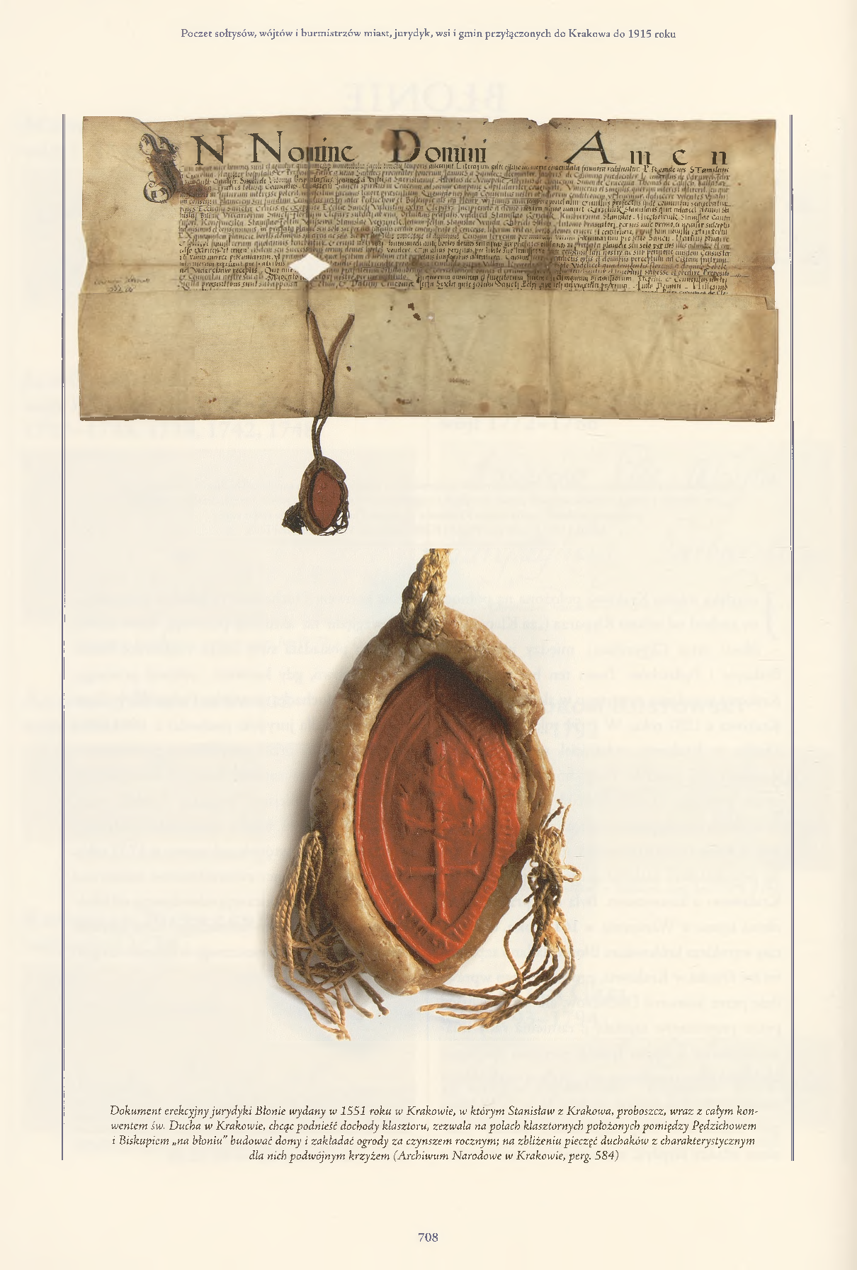 Pieczęć lakowa prowizoriatu szpitala św. Ducha używana w czynnościach urzędowych na terenie jurydyki Błonie: w kolistym polu mur obronny z bramą i trzema wieżami, ponad nim gołąb z rozpostartymi skrzydłami – zgodnie z przynależnością jurydyki połączono tu element godła miasta Krakowa z symbolem Ducha Świętego, w otoku napis: SIGILLUM PROVISORUM HOSPITALE S[ANCTI] SPIRITUS (Biblioteka Jagiellońska, sygn. BJ 739481 III, s. 173)Dokument erekcyjny jurydyki Błonie wydany w 1551 roku w Krakowie, w którym Stanisław z Krakowa, proboszcz, wraz z całym konwentem św. Ducha w Krakowie, chcąc podnieść dochody klasztoru, zezwala na polach klasztornych położonych pomiędzy Pędzichowem i Biskupiem „na błoniu” budować domy i zakładać ogrody za czynszem rocznym; na zbliżeniu pieczęć duchaków z charakterystycznym dla nich podwójnym krzyżem (Archiwum Narodowe w Krakowie, perg. 584)