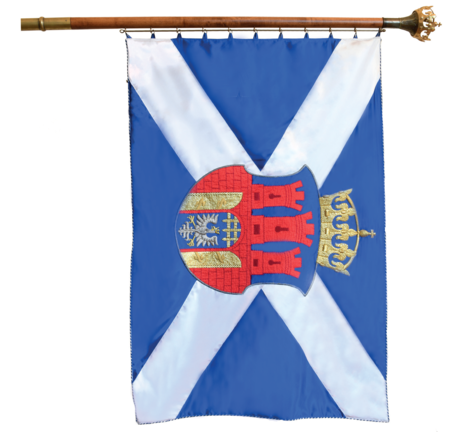 2) Chorągiew Stołecznego Królewskiego Miasta Krakowa, określoną w załączniku graficznym Nr 2 do uchwały. Chorągiew Stołecznego Królewskiego Miasta Krakowa przedstawia na błękitnym płacie biały ukośny krzyż, z herbem miasta umieszczonym na skrzyżowaniu ramion krzyża. Stosunek szerokości do długości płata wynosi 5:8.