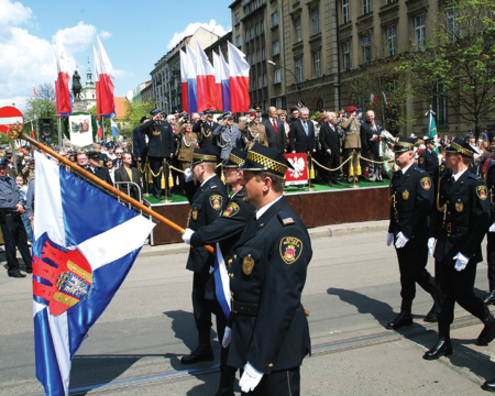 Sięgnijmy do korzeni: już przy okazji herbu miasta przywoływaliśmy kronikę Jana z Czarnkowa, w której autor opisał uroczysty wjazd do Krakowa króla Węgier Ludwika, obejmującego tron po śmierci Kazimierza Wielkiego, co miało miejsce w listopadzie 1370 r. Kronikarz zapisał, że w mieście zarządzono, aby rajcowie nieśli chorągiew, na której widniał herb miasta, oraz klucze. Oprócz tego podał, że swoje chorągwie niosły wówczas także inne grupy społeczności miejskiej, a to: mieszczanie krakowscy z purpurowemi chorągwiami […] i każdy cech rzemieślniczy, w oddzielnem gronie postępując, niósł swoją chorągiew, ozdobioną stosownemi godłami i kluczami (za: Kronika 1996, s. 27).