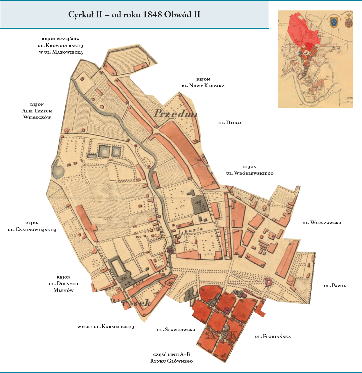 Cyrkuł II (od 1848 r. Obwód II) według stanu z końca roku 1838 na przywołanym wcześniej planie miasta z 1836 r. – dzielnica administracyjna w północnej części miasta. Obejmowała: północny fragment starego miasta w obrębie Plant, od kościoła Reformatów po ul. Floriańską, północną część Przedmieścia Piasek, od rejonu ulic Dolnych Młynów i Czarnowiejskiej po ul. Długą i pl. Nowy Kleparz oraz Przedmieście Kleparz, jednak bez jego dawnych północnych i wschodnich jurydyk (Błonie, Szlak, św. Floriana). Ten cyrkuł–obwód powstał z połączenia dwóch dawnych gmin miejskich Rzeczypospolitej Krakowskiej, tj. Gminy IV i Gminy VII (por. rozdział poprzedni). Użyte tutaj i przy powyższym planie dzielnicy nazwy terenowe podano według nazewnictwa obowiązującego aktualnie.
