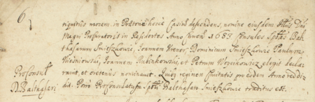 Z księgi radzieckiej Kazimierza obejmującej protokoły spraw z lat 1683–1685: wpis z 1683 roku zawierający wykaz rajców urzędujących nominowanych na tenże rok; w ich składzie rajca Dominik Śmieszkowicz – oraz zbliżenie zapisu imienia (Archiwum Narodowe w Krakowie, sygn. K 107, s. 6)