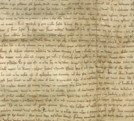 Powiększenie fragmentu aktu lokacyjnego z 1257 roku – oraz powiększenie zapisu imienia wójta (Archiwum Państwowe w Krakowie, sygn. perg. 2)