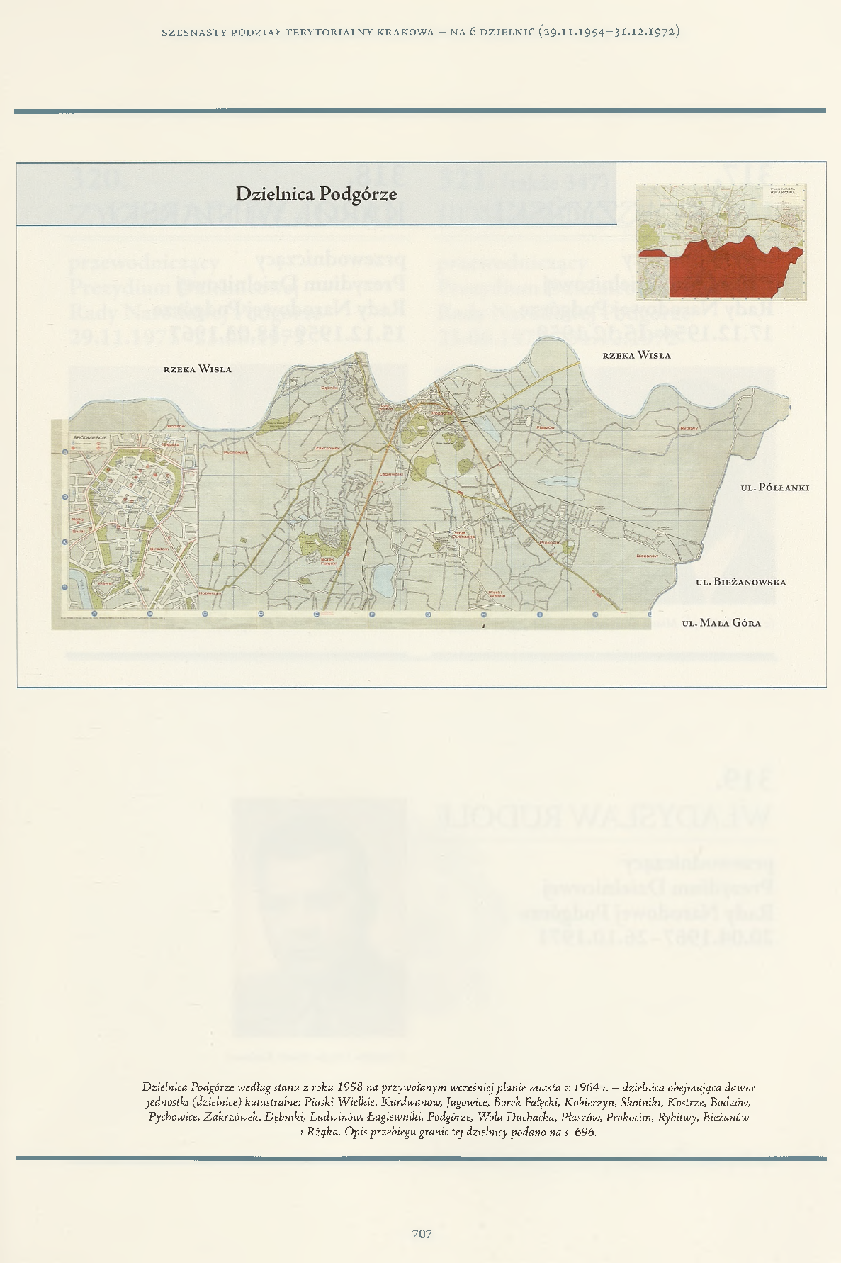 Dzielnica Podgórze według stanu z roku 1958 na przywołanym wcześniej planie miasta z 1964 r. – dzielnica obejmująca dawne jednostki (dzielnice) katastralne: Piaski Wielkie, Kurdwanów, Jugowice, Borek Fałęcki, Kobierzyn, Skotniki, Kostrze, Bodzów, Pychowice, Zakrzówek, Dębniki, Ludwinów, Łagiewniki, Podgórze, Wola Duchacka, Płaszów, Prokocim, Rybitwy, Bieżanów i Rżąka. Opis przebiegu granic tej dzielnicy podano na s. 696.