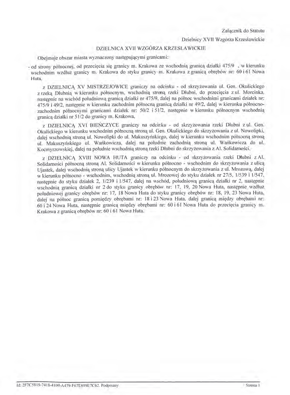 Dzielnica XVII Wzgórza Krzesławickie według stanu z 2017 r. na przywołanym wcześniej planie miasta z tego samego roku – dzielnica samorządowa o powierzchni 23,82 km² (udział 7,29% w całej powierzchni miasta), położona na terenach historycznych jednostek katastralnych: Krzesławice, Zesławice, Kantorowice, Grębałów, Lubocza, Łuczanowice, Wadów i Węgrzynowice, po części także Ruszcza, fragmentami Batowice, Mistrzejowice i Wróżenice (vide plan na s. 239). Opis przebiegu granic tej dzielnicy podano na następnej stronie.Z oryginału uchwały nr XCIX/1511/14 Rady Miasta Krakowa z dnia 12 marca 2014 r. w sprawie organizacji i zakresu działania Dzielnicy XVII Wzgórza Krzesławickie w Krakowie (Statut Dzielnicy XVII Wzgórza Krzesławickie)