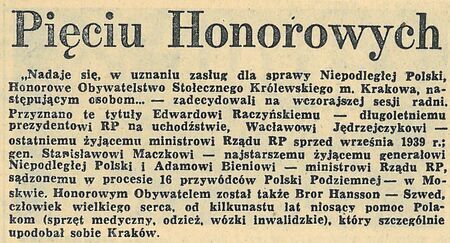 Duplikat dyplomu honorowego obywatelstwa oraz notatka prasowa z „Dziennika Polskiego” z 1993 r., nr 110, dotycząca nadania tytułów honorowych obywateli Krakowa 14 maja 1993 r.