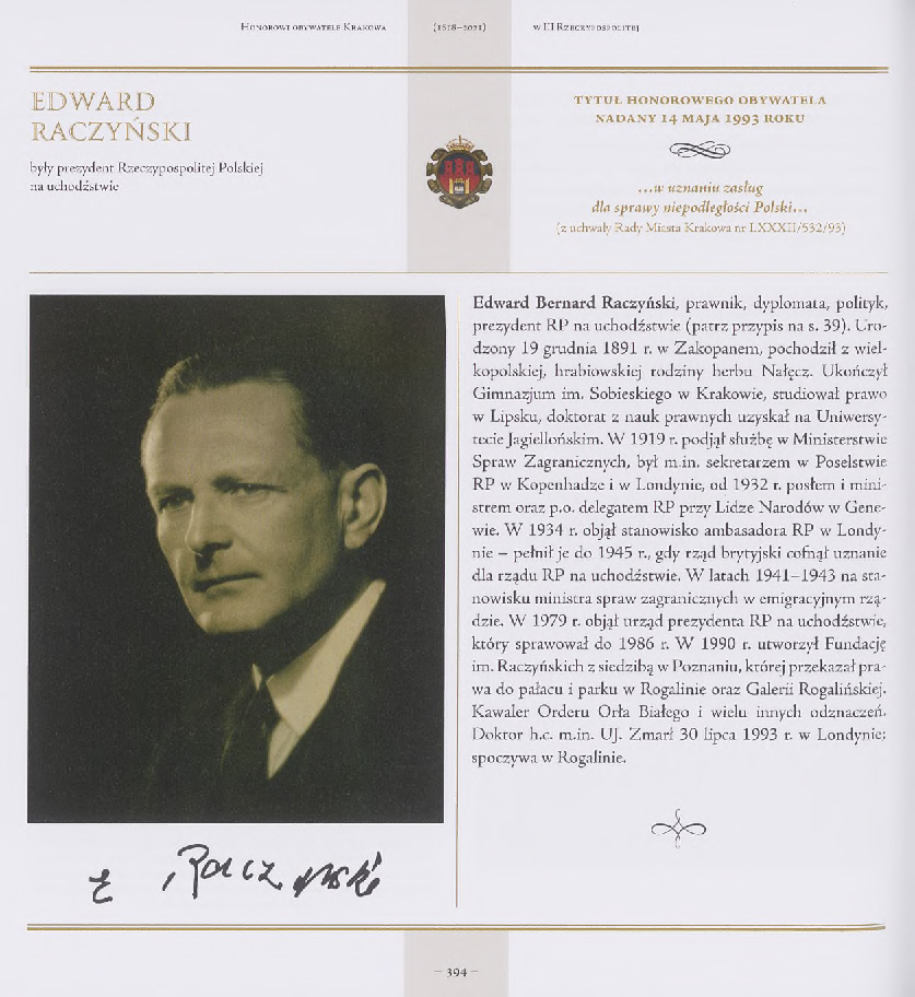Edward Bernard Raczyński, prawnik, dyplomata, polityk, prezydent RP na uchodźstwie (patrz przypis na s. 39). Urodzony 19 grudnia 1891 r. w Zakopanem, pochodził z wielkopolskiej, hrabiowskiej rodziny herbu Nałęcz. Ukończył Gimnazjum im. Sobieskiego w Krakowie, studiował prawo w Lipsku, doktorat z nauk prawnych uzyskał na Uniwersytecie Jagiellońskim. W 1919 r. podjął służbę w Ministerstwie Spraw Zagranicznych, był m.in. sekretarzem w Poselstwie RP w Kopenhadze i w Londynie, od 1932 r. posłem i ministrem oraz p.o. delegatem RP przy Lidze Narodów w Genewie. W 1934 r. objął stanowisko ambasadora RP w Londynie – pełnił je do 1945 r., gdy rząd brytyjski cofnął uznanie dla rządu RP na uchodźstwie. W latach 1941–1943 na stanowisku ministra spraw zagranicznych w emigracyjnym rządzie. W 1979 r. objął urząd prezydenta RP na uchodźstwie, który sprawował do 1986 r. W 1990 r. utworzył Fundację im. Raczyńskich z siedzibą w Poznaniu, której przekazał prawa do pałacu i parku w Rogalinie oraz Galerii Rogalińskiej. Kawaler Orderu Orła Białego i wielu innych odznaczeń. Doktor h.c. m.in. UJ. Zmarł 30 lipca 1993 r. w Londynie; spoczywa w Rogalinie.