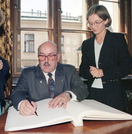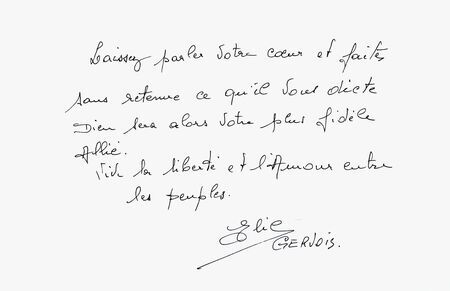 Z uroczystości wręczenia medalu z dyplomem 19 czerwca 1998 r. Elie Gervois podczas wystąpienia w sali Obrad RMK oraz własnoręczny podpis uhonorowanego.