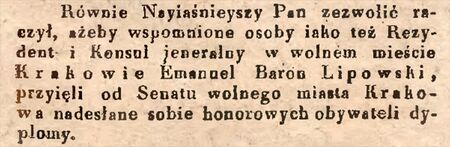 Tytuł nadany uchwałą Senatu Rządzącego nr obrad 1379, nr Dziennika Głównego 2632 (ANK, sygn. WMK IV-6, s. 191) podjętą 17 sierpnia 1819 r., gdy prezesurę Senatu Rządzącego sprawował Stanisław Wodzicki. Była to wspólna uchwała dla czterech uczestników zespołu demarkacyjnego wyznaczającego granice WMK: z ramienia Austrii Emanuela Lipowskiego i Emmericha von Blagoevicha oraz z ramienia Prus Fryderyka Adolfa Boscampa i Jana Nepomucena Metticha. Uhonorowanie nastąpiło w związku z zakończeniem prac nad wytyczeniem granic WMK z sąsiadującymi Królestwem Polskim, Austrią i Prusami.