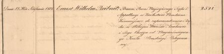 Fragment wpisu do Księgi obywatelskiej… WMK; obok dwa odciski w laku pieczęci Reibnitza: osobistej herbowej oraz urzędowej jako pruskiego komisarza ds. organizacji WMK;