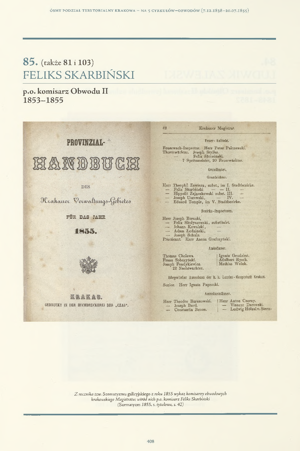 Z rocznika tzw. Szematyzmu galicyjskiego z roku 1855 wykaz komisarzy obwodowych krakowskiego Magistratu; wśród nich p.o. komisarz Feliks Skarbiński (Szematyzm 1855, s. tytułowa, s. 42)