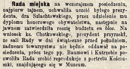 …w uznaniu zasług byłego prezydenta miasta … około dobra miasta… (z uchwały Rady Miejskiej – DzUMK 1894, L. 3, s. 15) |