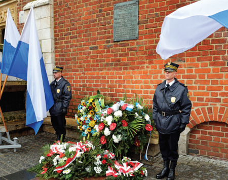 (173) Oprawa flagowa przy składaniu wieńców pod wmurowaną w ścianę Ratusza w Rynku Głównym tablicą upamiętniającą oswobodzenie miasta spod austriackiego zaboru – w 99. rocznicę tego wydarzenia, obchodzoną 27 października 2017 r. (z zasobów UMK)