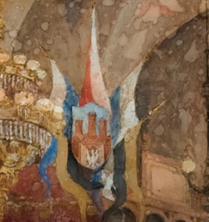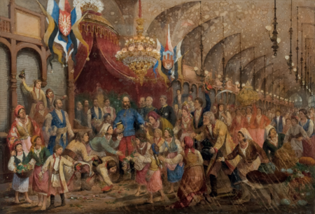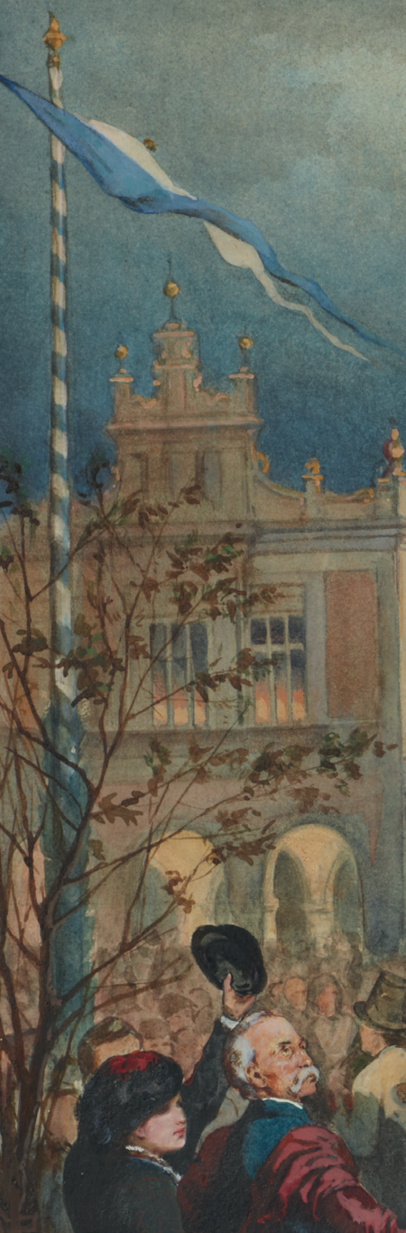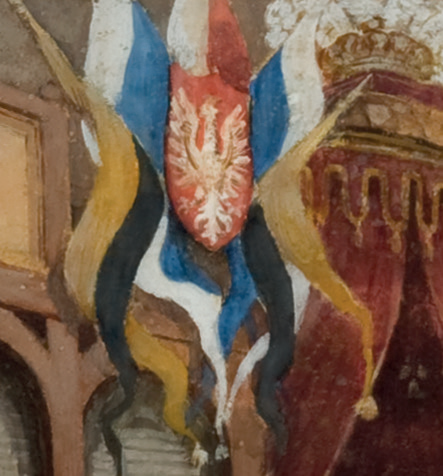 (168–170) Z cyklu Podróż inspekcyjna cesarza Franciszka Józefa I po Galicji we wrześniu 1880 r. akwarela Hipolita Lipińskiego z 1881 r. Cesarz w Sukiennicach wśród ludu krakowskiego – oraz powiększenie dwóch dekoracji herbowo-flagowych z wnętrza Sukiennic; widoczne flagi w barwach analogicznie jak na il. 166 (MNK, nr inw. III-r.a-12777)