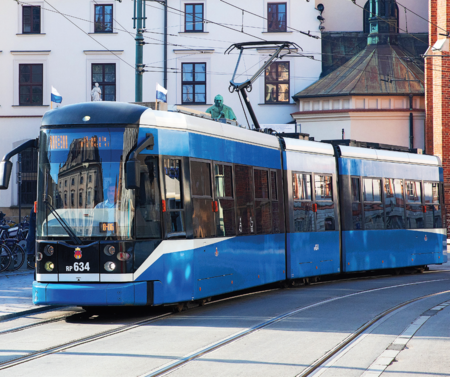 (174) W miejskich galach flagowych zawsze uczestniczy tabor komunikacji zbiorowej; jego wozy są stałymi nośnikami dwóch symboli Krakowa: barw miasta i herbu, a na okoliczność świąt także flagi miasta – tutaj przykład uwieczniony na pl. Wszystkich Świętych (z zasobów UMK)
