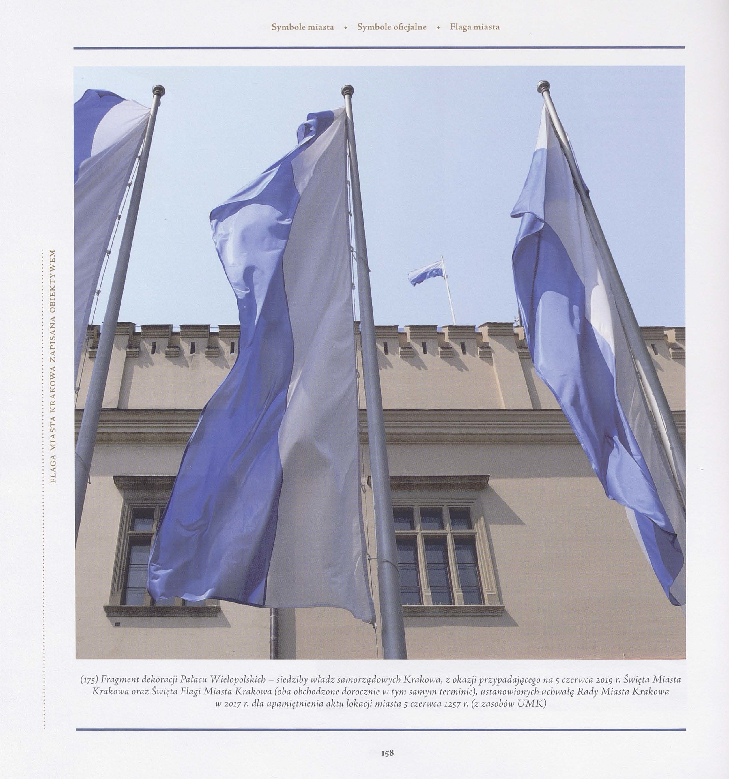 Przywoływano już wcześniej uchwałę Rady Miasta Krakowa z 1991 r. w sprawie herbu i barw Stołecznego Królewskiego Miasta Krakowa. W załączniku do niej ukazano tytułowe dla uchwały barwy miasta przez rysunek – grafikę flagi miasta (zob. il. 162).