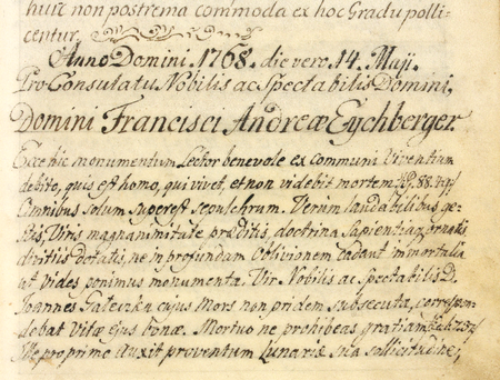 Z urzędowego spisu rajców obejmującego lata 1363–1802 fragment strony 103 z wpisem o wyborze do rady miejskiej na miejsce po zmarłym Janie Gałeczce (nr 607) Jana Fryderyka Sztumera (nr 633), czego dokonano za kadencji burmistrzowskiej Franciszka Andrzeja Eichbergera w 1768 roku – oraz powiększenie zapisu imienia i funkcji burmistrza (Archiwum Państwowe w Krakowie, sygn. rkps 1477, s. 103)