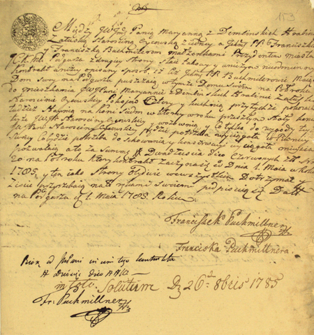 Z księgi ślubów Liber Copulatorum z lat 1784–1800 parafii św. Józefa w Podgórzu: wpis z 1784 roku poświadczający zawarcie związku małżeńskiego między Stanisławem Laszczyńskim a Reginą Wiszowską, czemu świadkował Franciszek Buchmiller, burmistrz Podgórza, tu określony jako „prezydent” – oraz zbliżenie fragmentu z zapisem imienia i urzędu (Archiwum parafii św. Józefa w Podgórzu, Liber Copulatorum, t. I, s. 1)Z księgi ślubów Liber Copulatorum z lat 1784–1800 parafii św. Józefa w Podgórzu: wpis z 1789 roku poświadczający zawarcie związku małżeńskiego między Marcinem Pileckim de Okocim a Marianną Okońską (córką Tomasza, byłego wójta podgórskiego), czemu świadkował Franciszek Buchmiller, były już burmistrz Podgórza, tu określony tytularnie jako proconsul – oraz zbliżenie fragmentu z zapisem imienia i urzędu (Archiwum parafii św. Józefa w Podgórzu, Liber Copulatorum, t. I, s. 14)Z Archiwum Siedliszowickiego Załuskich: kontrakt z 1785 roku na wynajem mieszkania zawarty między starościną ojcowską Marianną z Dembińskich Załuską a właścicielami domu w Podgórzu, Franciszkiem Buchmillerem, burmistrzem, i jego żoną Franciszką – oraz zbliżenie podpisów (Archiwum Narodowe w Krakowie, sygn. ASZ 29, s. 153)