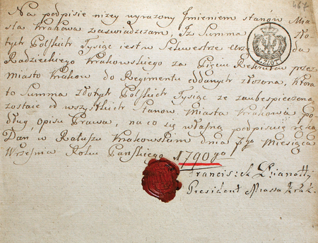 Z miejskich akt i rachunków do kontrybucji wojskowych i wydatków na wojsko z lat 1773–1793 zaświadczenie z 7 września 1790 roku dotyczące złożenia kwoty sekwestrowej 1000 złotych polskich w związku z wystawieniem przez miasto pięciu rekrutów do regimentu, podpisane przez Franciszka Dzianottiego, wówczas burmistrza – oraz powiększenie zapisu imienia i funkcji burmistrza, tu nazwanego prezydentem (Archiwum Państwowe w Krakowie, sygn. rkps 2966, s. 467)