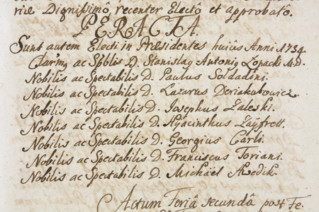 Z księgi radzieckiej obejmującej lata 1729–1736 fragment strony 1371 z wykazem rajców urzędujących nominowanych na rok 1734, wśród których znajduje się Franciszek Toryani – oraz powiększenie zapisu imienia (Archiwum Państwowe w Krakowie, sygn. rkps 477, s. 1371)