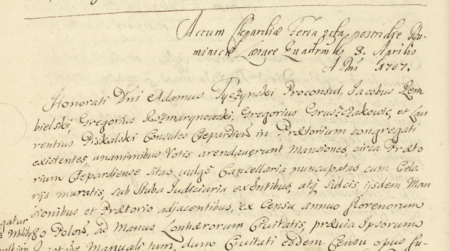 Z księgi radzieckiej Kleparza obejmującej lata 1695–1734: fragment wpisu z 1707 roku otwierającego kolejną sesję rajców, z Grzegorzem Gruszczakowiczem w składzie – oraz zbliżenie zapisu imienia (Archiwum Narodowe w Krakowie, sygn. KL 33, s. 235)