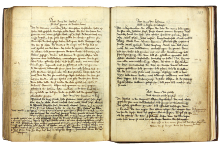 Z Kodeksu Grabowskiego strony 182–183 z wpisem wydanego w 1381 roku w Krakowie dokumentu, w którym rajcy krakowscy, a wśród nich Heinmann Huter, zobowiązują się, że przeciw Żydowi Lewkowi nie będą wnosić pretensji z tytułu lichwy – oraz powiększenie zapisu imienia (Archiwum Państwowe w Krakowie, sygn. rkps 1447a, s. 182–183)