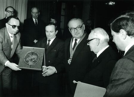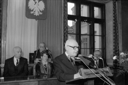 Wręczenie dyplomu oraz ozdobnej patery z motywami krakowskich zabytków, w sali Obrad Rady 18 stycznia 1988 r. Widoczni: drugi od prawej strony – Henryk Jabłoński, trzeci – przewodniczący Rady Apolinary Kozub, czwarty – prezydent miasta Tadeusz Salwa; wystąpienie uhonorowanego z mównicy prezydialnej sali Obrad Rady.