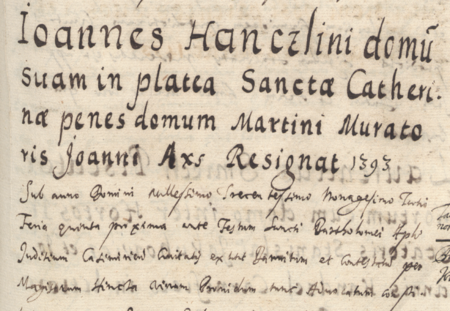 Z Liber inscriptionum… klasztoru oo. Augustianów w Kazimierzu: początkowy fragment dokonanego w roku 1681 wpisu potwierdzającego, że w 1393 roku wójt kazimierski Heynko magister i ława miejska potwierdzili transakcję sprzedaży domu położonego przy ul. św. Katarzyny, obok domu Marcina budowniczego, zawartej między Janem synem Henczlina a Janem Axsą – oraz zbliżenie zapisu imienia (Biblioteka Naukowa PAU/PAN, sygn. rkps 1676, s. 307)