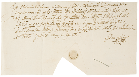 Dokument wystawiony w 1588 roku w Krakowie przez Hieronima Horlemesa, w którym kwituje on podskarbiego Młodziejowskiego z zapłaty długu – oraz powiększenie znaku pieczętnego (gmerku) Hieronima Horlemesa (Muzeum Narodowe w Krakowie, Biblioteka Książąt Czartoryskich, sygn. rkps 574/63)