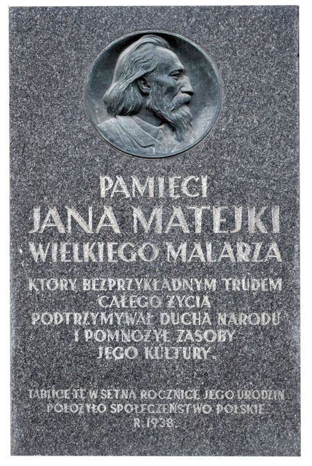 Z prawej strony popiersie Jana Matejki, honorowego obywatela Krakowa z 1882 r., znajdujące się na wschodniej elewacji budynku Pałacu Sztuki – Towarzystwa Przyjaciół Sztuk Pięknych w Krakowie; dzieło Antoniego Madeyskiego odsłonięte w 1901 r. Z lewej strony tablica upamiętniająca Jana Matejkę, odsłonięta na budynku Akademii Sztuk Pięknych w Krakowie w 1938 r., w 100. rocznicę urodzin mistrza.