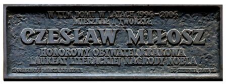 Tablice z krakowskich domów mieszkalnych upamiętniające: Czesława Miłosza, honorowego obywatela Krakowa z 1993 r. – z kamienicy przy ul. Bogusławskiego, odsłonięta w 2005 r., dzieło Czesława Dźwigaja;