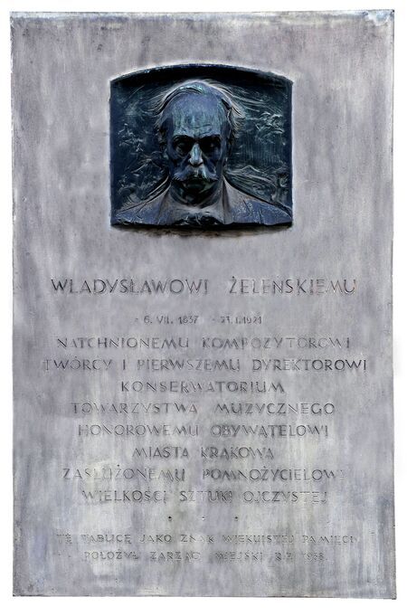 Tablica upamiętniająca Władysława Żeleńskiego, honorowego obywatela Krakowa z 1912 r., wmurowana obok wejścia do budynku Narodowego Starego Teatru im. Heleny Modrzejewskiej w Krakowie przy ul. Jagiellońskiej. W inskrypcji m.in.: NATCHNIONEMU KOMPOZYTOROWI / TWÓRCY I PIERWSZEMU DYREKTOROWI / KONSERWATORIUM / TOWA- RZYSTWA MUZYCZNEGO / HONOROWEMU OBYWATELOWI / MIASTA KRAKOWA / ZASŁUŻONEMU POMNOŻYCIELOWI / WIELKOŚCI SZTUKI OJCZYSTEJ / TĘ TABLICĘ JAKO ZNAK WIE- KUISTEJ PAMIĘCI / POŁOŻYŁ ZARZĄD MIEJSKI R. P. 1938. |