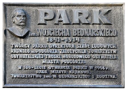 Płyta upamiętniająca twórcę parku w Podgórzu, Wojciecha Bednarskiego, honorowego obywatela Podgórza z roku 1896, od 2015 r. także Krakowa. W inskrypcji zapisano m.in.: TWÓRCY PARKU, DYREKTORA SZKÓŁ LUDOWYCH, / RADNEGO m. PODGÓRZA, ZAŁOŻYCIELA TOWARZYSTW / OBYWATELSKIEJ TROSKI, HONOROWEGO OBYWATELA / MIA- STA PODGÓRZA. / W 100-LECIE OTWARCIA PARKU W 1996 r. / RADA MIASTA KRAKOWA, / TOWARZYTSWO im. W. BEDNARSKIEGO I RODZINA. |