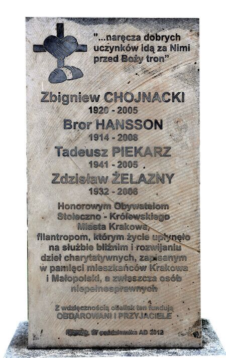 Postawiona w roku 2012 w bezpośrednim otoczeniu kościoła Św. Krzyża tablica poświęcona pamięci pięciu zasłużonych dla Krakowa filantropów, z których – wbrew treści tej tablicy – tylko jeden, a to Bror Hansson, otrzymał honorowe obywatelstwo Krakowa (1993 r.), natomiast trzej pozostali zostali laureatami medalu „Cracoviae Merenti”: Zbigniew Chojnacki srebrnego (2000 r.), Tadeusz Piekarz brązowego (2001) i Zdzisław Żelazny także brązowego (2007 r.). W inskrypcji zapisano m.in.: Honorowym Obywatelom / Stołeczno-Królewskiego / Miasta Krakowa, / filantropom, którym życie upłynęło / na służbie bliźnim i rozwijaniu / dzieł charytatywnych, zapisanym / w pamięci mieszkańców Krakowa / i Małopolski, a zwłaszcza osób / niepełnosprawnych / Z wdzięcznością obelisk ten fundują / OBDAROWANI I PRZYJACIELE. |