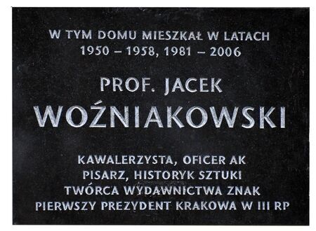 Jacka Woźniakowskiego, laureata srebrnego medalu „Cracoviae Merenti” w 1995 r. – z kamienicy przy ul. Pijarskiej, odsłonięta w 2013 r.;