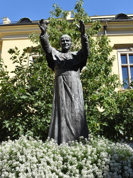 Pomnik papieża Jana Pawła II, laureata złotego medalu „Cracoviae Merenti” w roku 1993, dzieło włoskiej rzeźbiarki Jole Sensi Croci – dar artystów włoskich dla Krakowa; odsłonięty w 1980 r. jako pierwszy pomnik Jana Pawła II w Polsce, zlokalizowany na dziedzińcu Pałacu Biskupiego przy ul. Franciszkańskiej. |