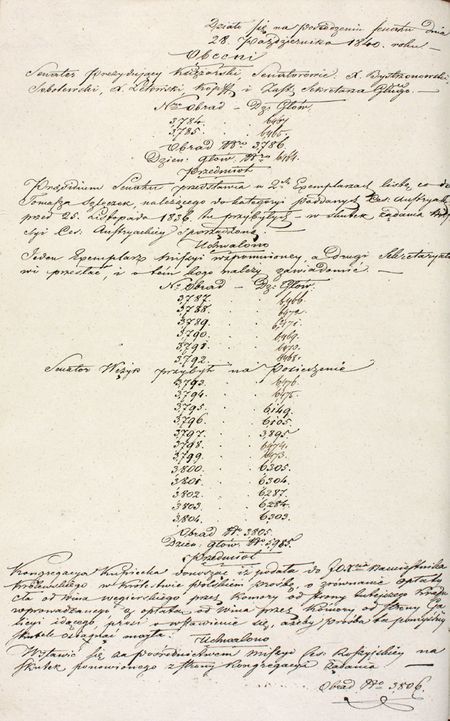 Z księgi protokołów obrad Senatu Rządzącego Wolnego Miasta Krakowa w 1840 roku przód oprawy i strona 162 z początkiem protokołu obrad z 28 października tegoż roku prowadzonych pod prezydencją Jacka Księżarskiego – oraz powiększenie zapisu imienia i funkcji (Archiwum Państwowe w Krakowie, sygn. WMK IV-29, s. 162)