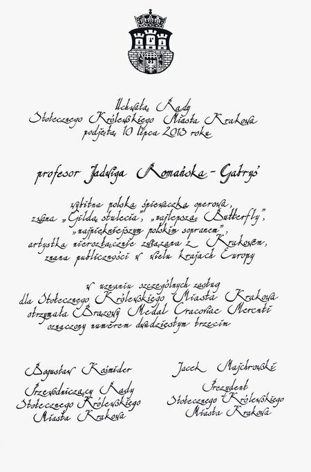 Z uroczystości wręczenia medalu z dyplomem 16 października 2013 r. w Pałacu Wielopolskich. Jadwiga Romańska-Gabryś w Sali Obrad RMK oraz własnoręczny podpis uhonorowanej.