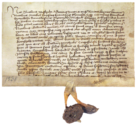 Dokument wydany w 1438 roku w Kazimierzu, w którym wójt i ławnicy kazimierscy stwierdzają, że Mikołaj Gedanke odstąpił swój dom położony w Rynku Głównym Jakubowi Swidniczerowi i jego żonie Katarzynie – oraz powiększenie zapisu imienia (Archiwum Państwowe w Krakowie, sygn. perg. 202)
