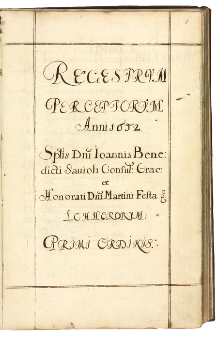 Z księgi miejskiej rachunkowej obejmującej rok 1652 strona tytułowa otwierająca rachunki miejskie prowadzone za kadencji lonera Jana Benedykta Savioli – rajcy krakowskiego – oraz powiększenie zapisu imienia i urzędu rajcy (Archiwum Państwowe w Krakowie, sygn. rkps 1756, s. 3)